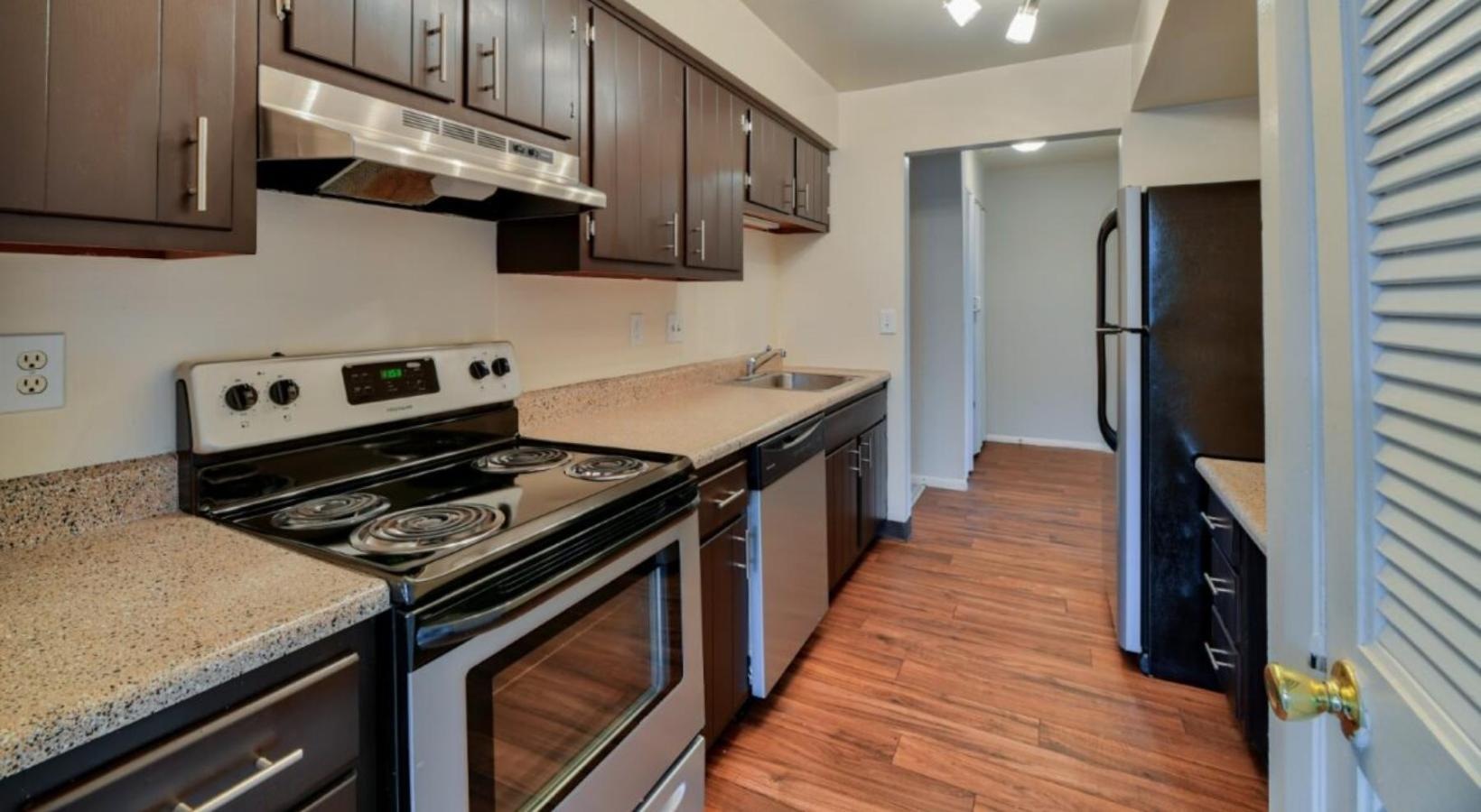 • a kitchen with wooden cabinets