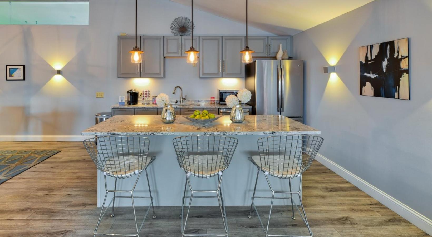 • a kitchen with a bar and chairs