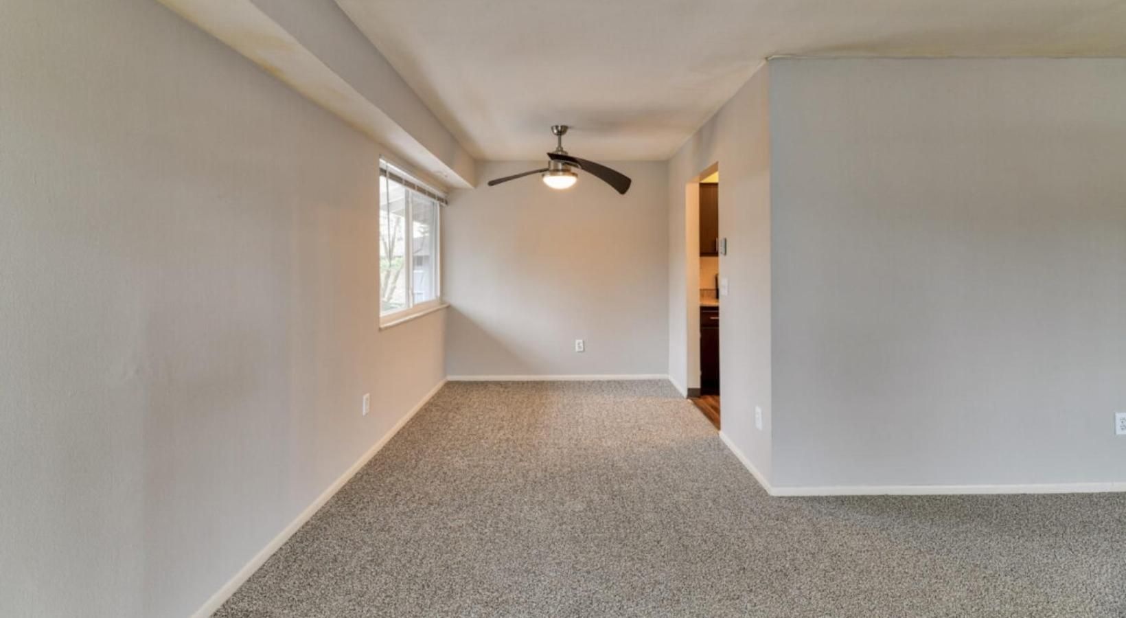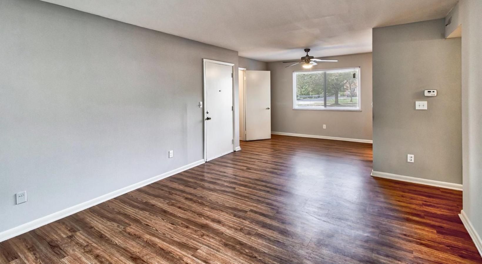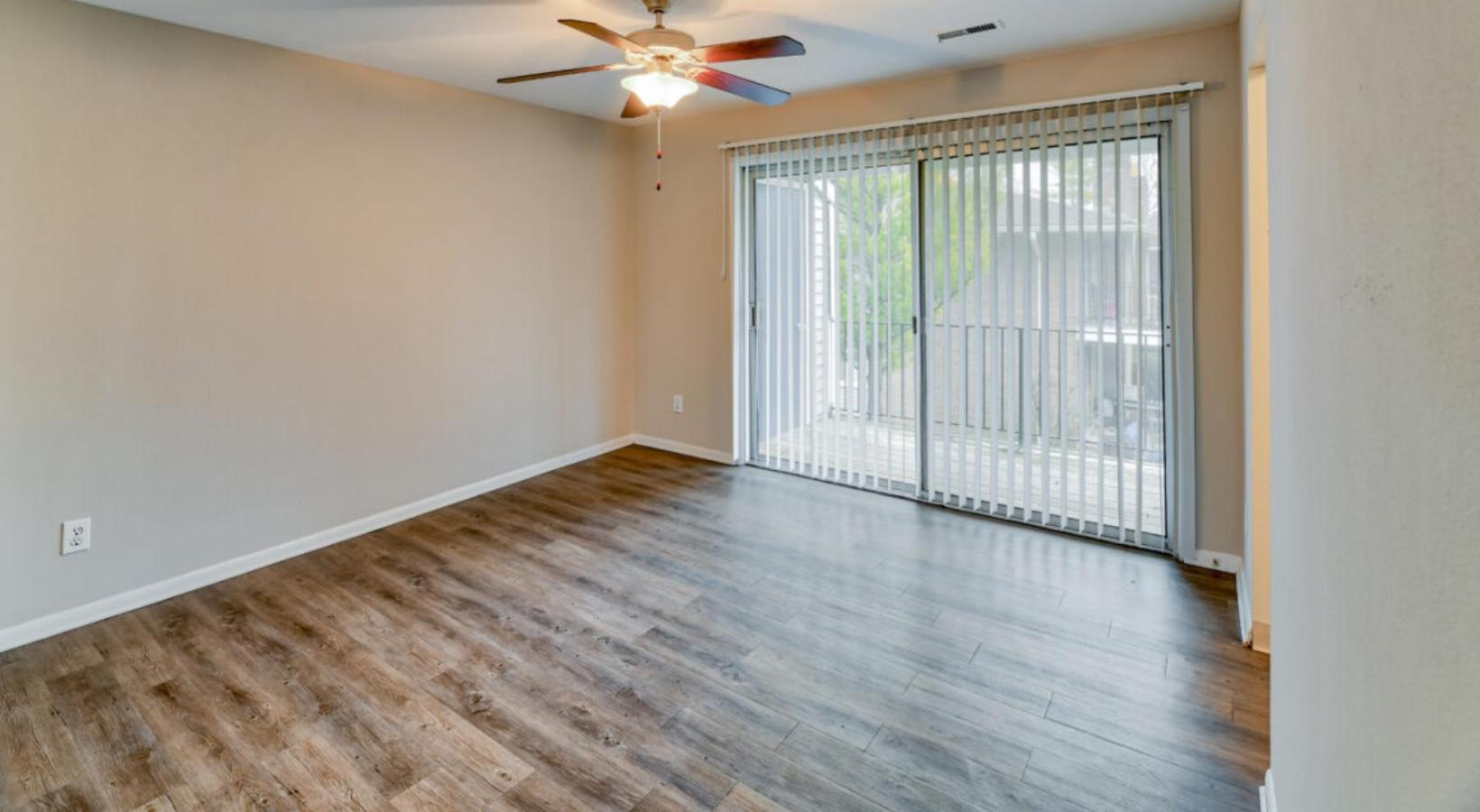 • a room with a wood floor and a ceiling fan