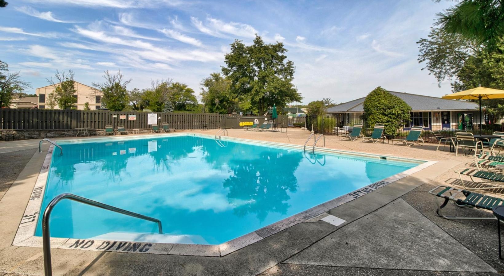 • a swimming pool with a fence and trees in the background